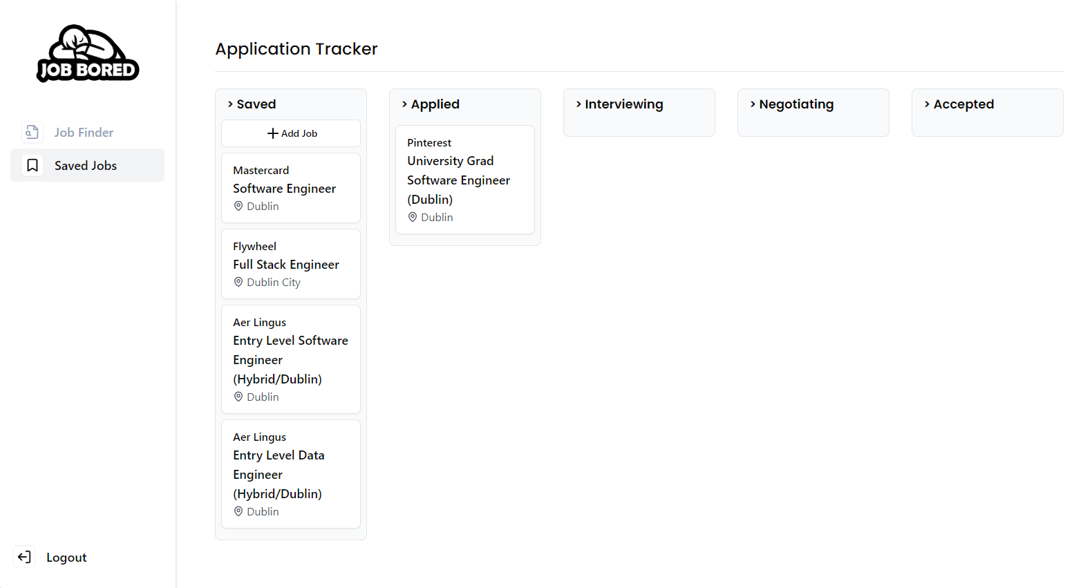 The idea of Job Bored is an "Inbox Zero" for jobs. You get a feed of jobs from different public job sources according to your settings, and you can save them or hide them, until your inbox is zero.
