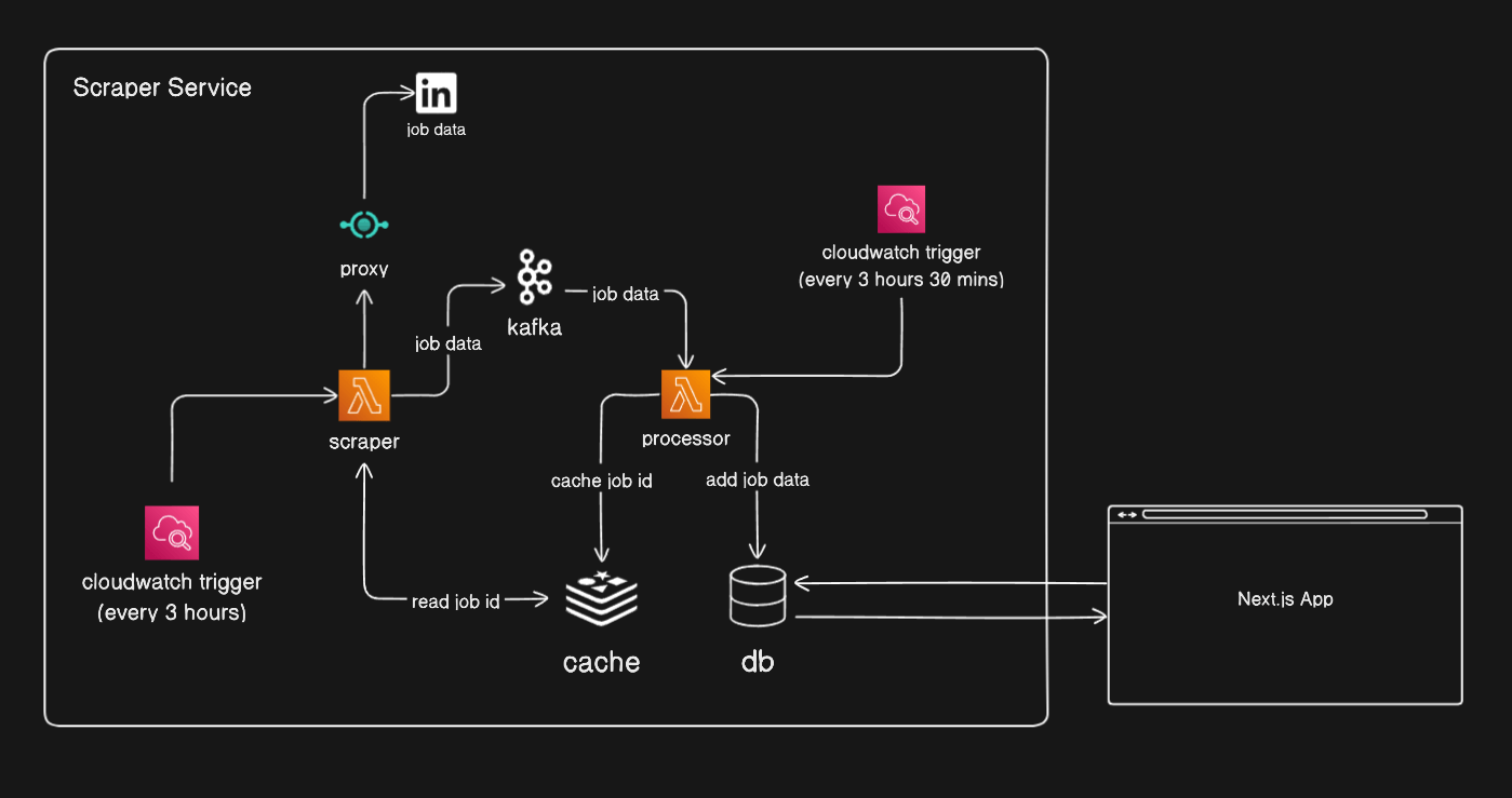 The scraper service uses AWS Lambda, Cloudwatch provisioned with Terraform, and Redis and Kafka from Upstash.